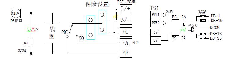 接線圖: 雙有源用于電動執行器等設備。 常用設置: 回路設置:改變保險位置可切換輸出方式 (接線板上預留保險插孔,保險可改變位置) 輸入共陰共陽設置:開關K 電源設置: 每個DB 口都含有4 芯電源線,用于向PLC 模塊供電。這些電源由電源輸出設置的短路帽進行控制,每個短路帽對應一根線,詳見下圖,送電前應根據需要進行設置。電源指示在保險下方,電源接反或保險燒斷時電源燈不亮。 注意:為實現信號的徹底隔離,內外電源必須做到隔離,因此本板需要外部電源,在端子板的左下角標注為L+/N-的端子為外部電源端子,分為兩組,1-16 路為一組,17-32 路為一組。每組電源提供了兩組電源端子用于提高供電能力,須根據負載需要提供DC24V 或AC220V,干接點輸出時無需提供電源。